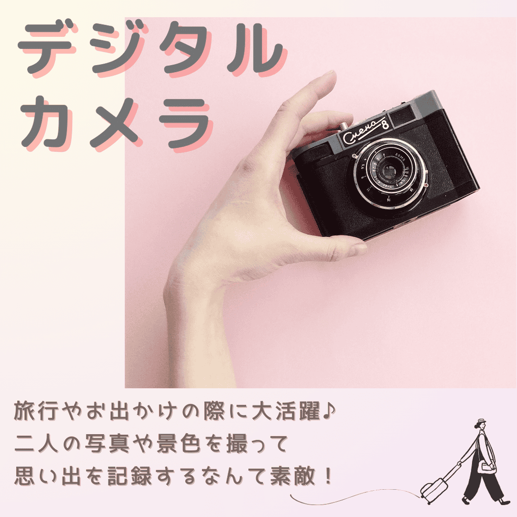 デジタルカメラやチェキ、GoProのようなふたりの思い出を残せるものや、ゲームやプロジェクターなどふたりの時間を楽しめるものなど、なんでもOKです!