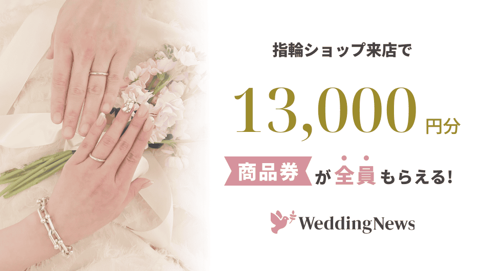 こちらは8月1日(木)に開始されるウェディングニュースの指輪予約サービスから来店予約をして、実際に来店しアンケートなどに答えていただくだけで、13,000円分のギフト券をプレゼント!