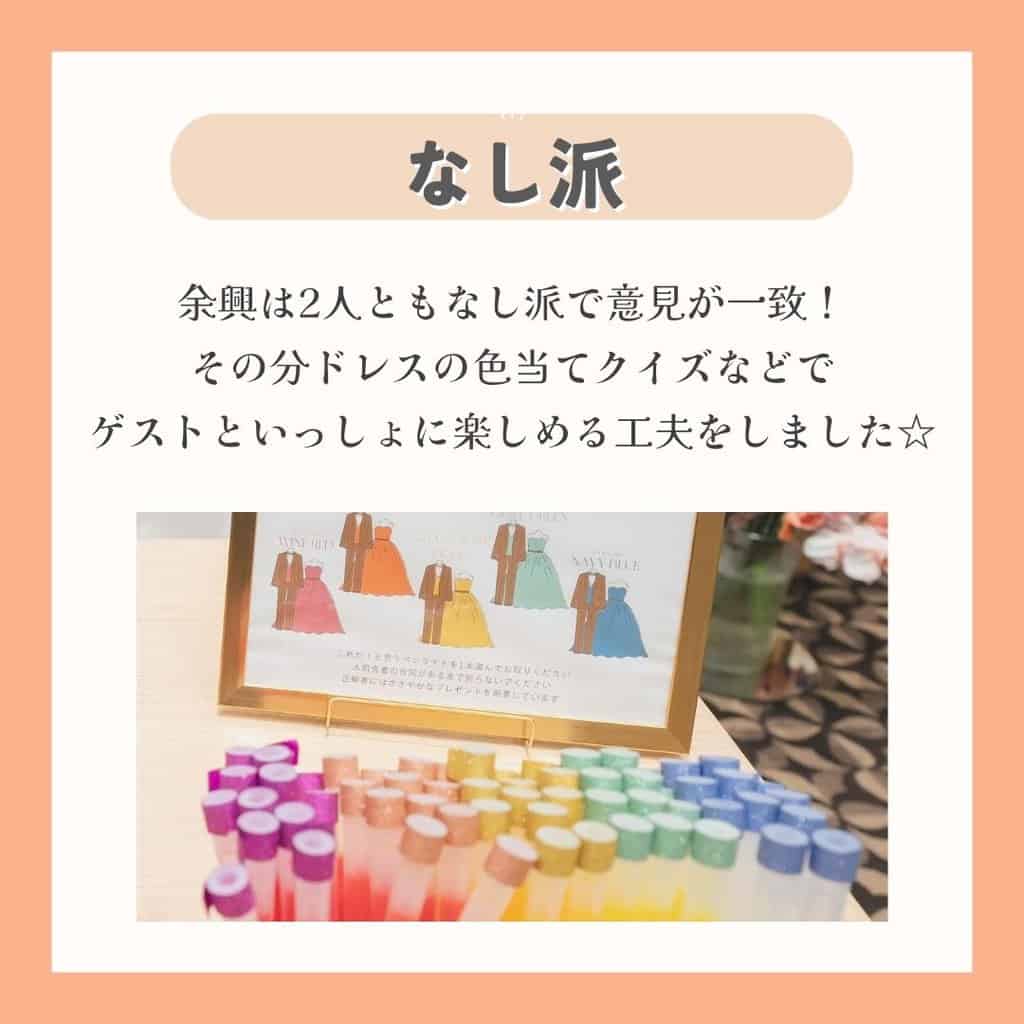 皆さんは、ゲストにダンスや演奏などをしてもらい盛り上がる余興あり派と、ドレス色当てクイズやフォトラウンドなどゲストと一緒に楽しめる余興なし派どっちを選びましたか?