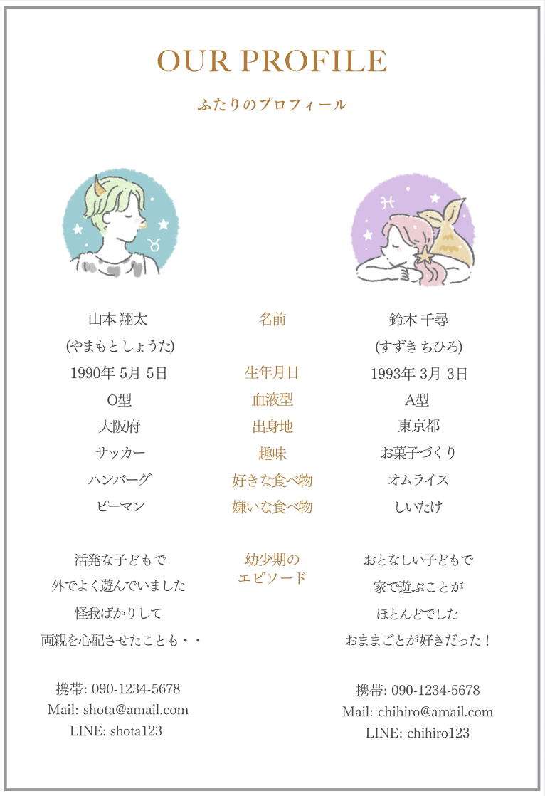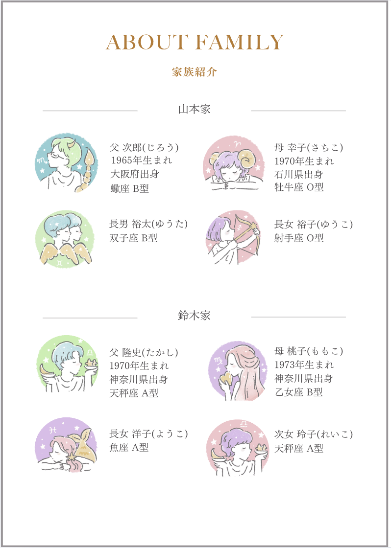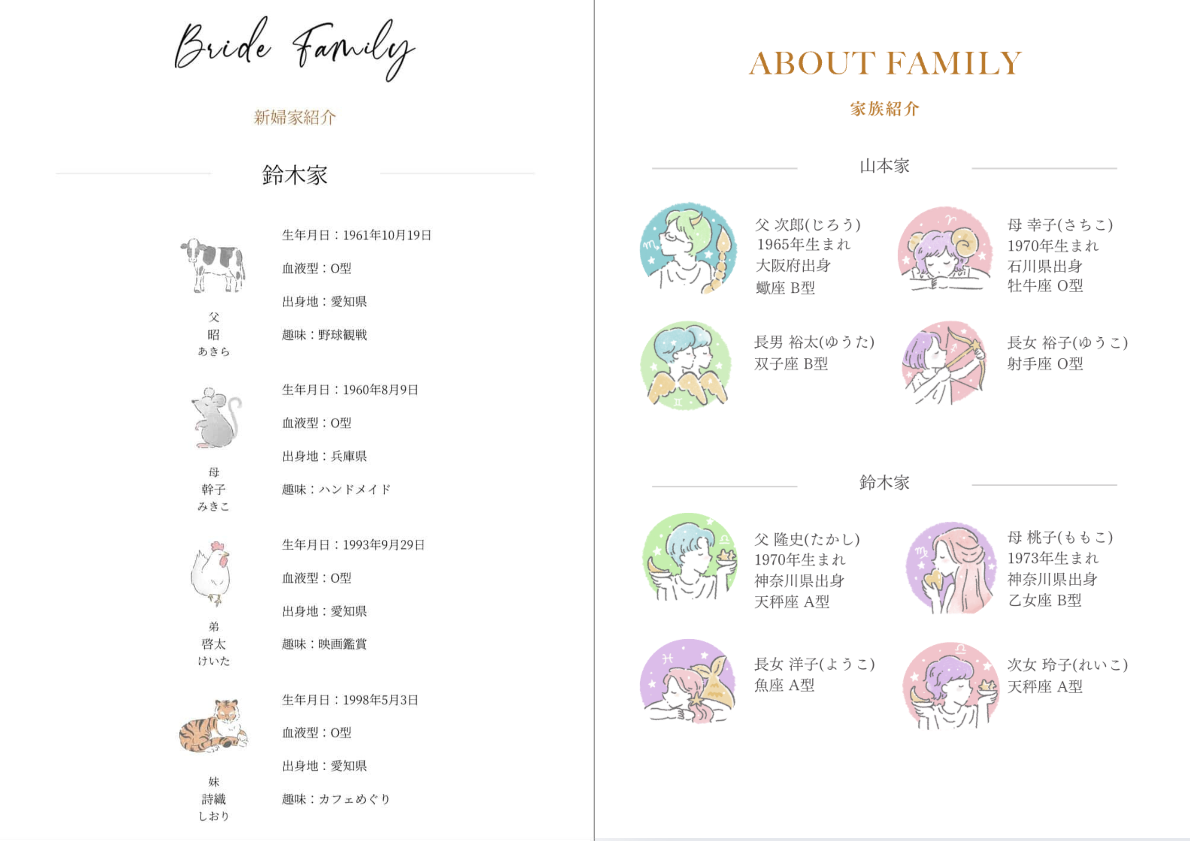 そこで、両家顔合わせしおりの「家族紹介」や「プロフィール」に使えるオリジナル干支・星座イラストをご用意いたしました!