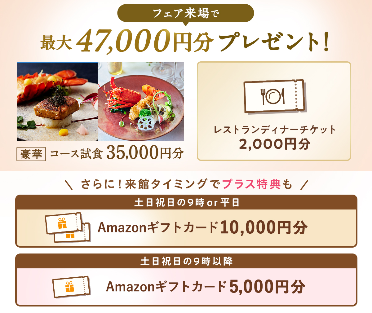 フェア参加で35,000円相当の豪華コース試食の他、レストランランチチケットやディナーチケットもプレゼント♡そして、ご来館のタイミングでAmazonギフトを最大10,000円分貰えて、フェア参加だけで最大47,000円分の特典が貰えちゃう♪