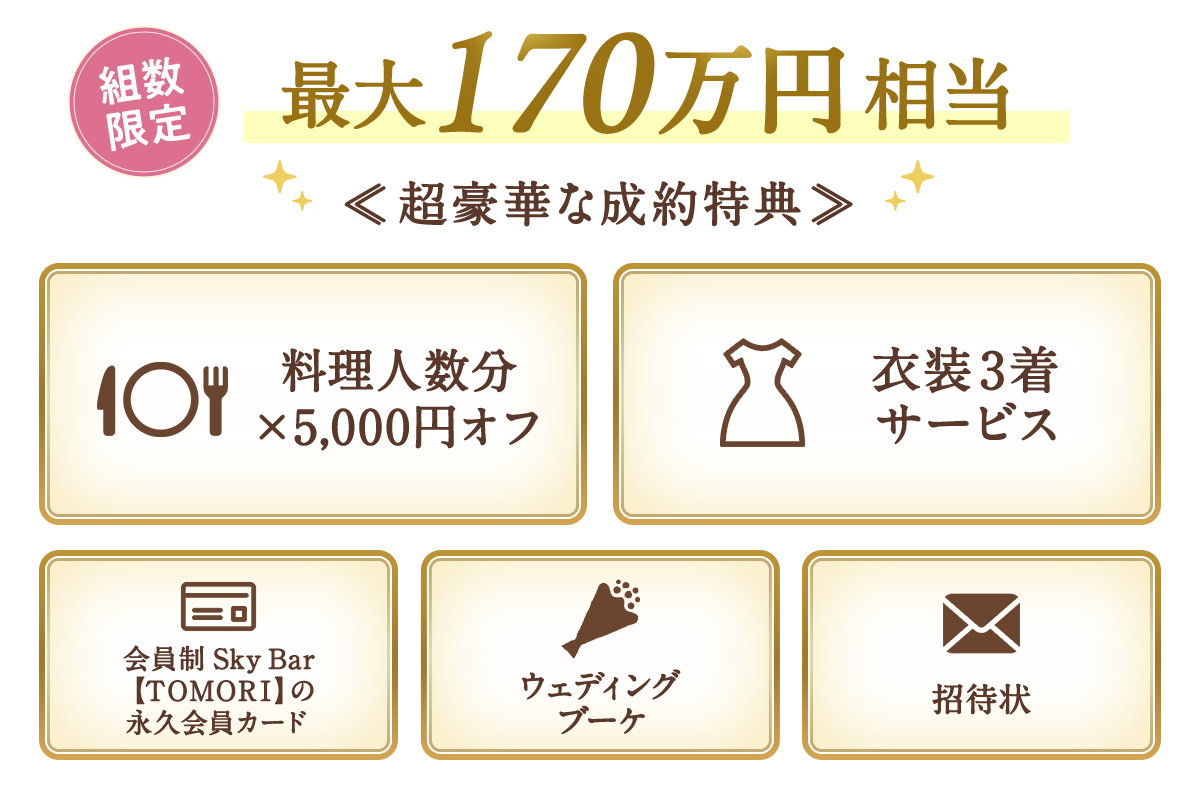 年に一度のお得!! 4/11(土)〜5/10(日)【メガBIGキャンペーン】開催!料理人数分×5000円オフや衣装3着サービスなど、最大170万円の成約特典♪