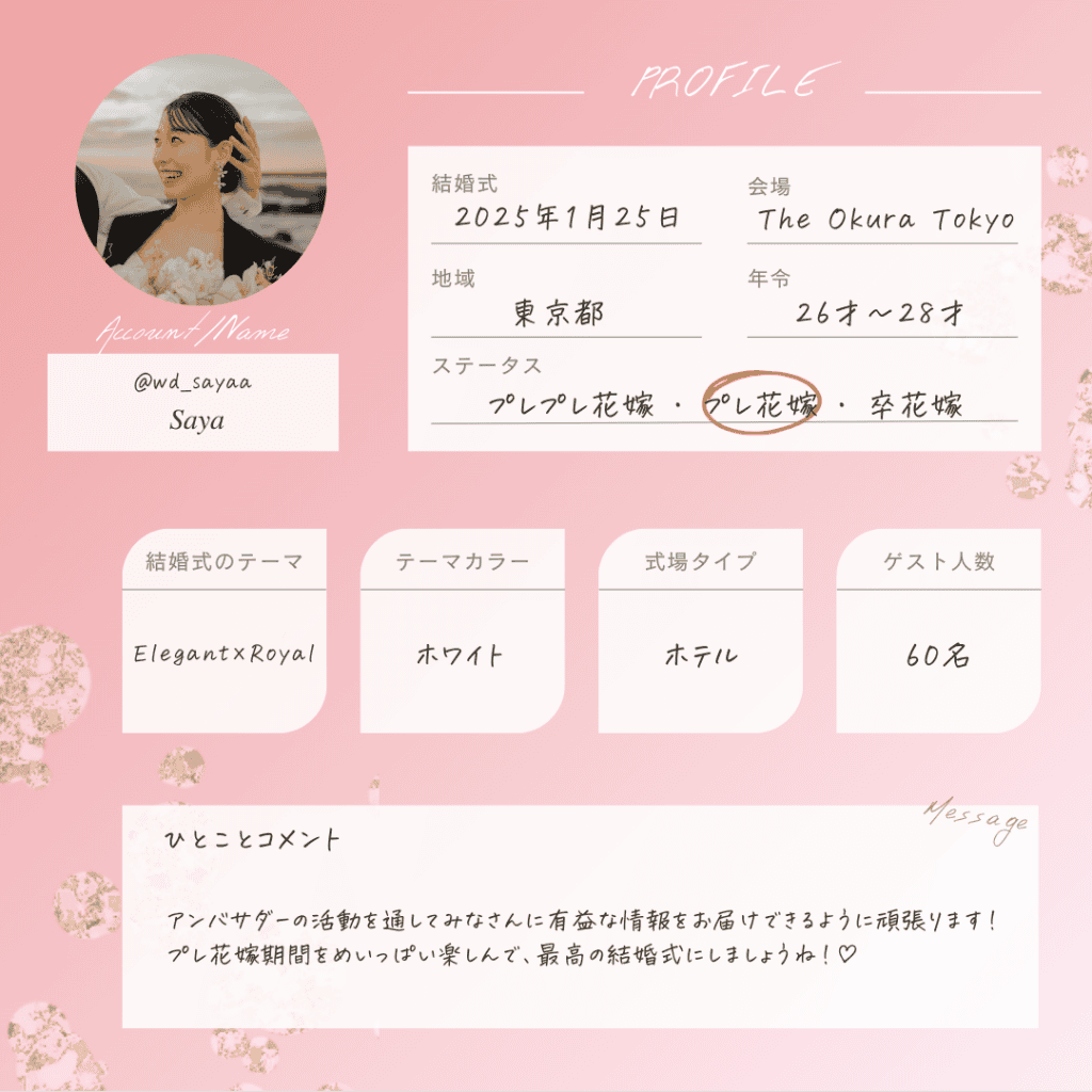 ウェディングニュース公式アンバサダーとは、私たち編集部と一緒にインスタやアプリなどを盛り上げてくれる公式メンバーのこと♡