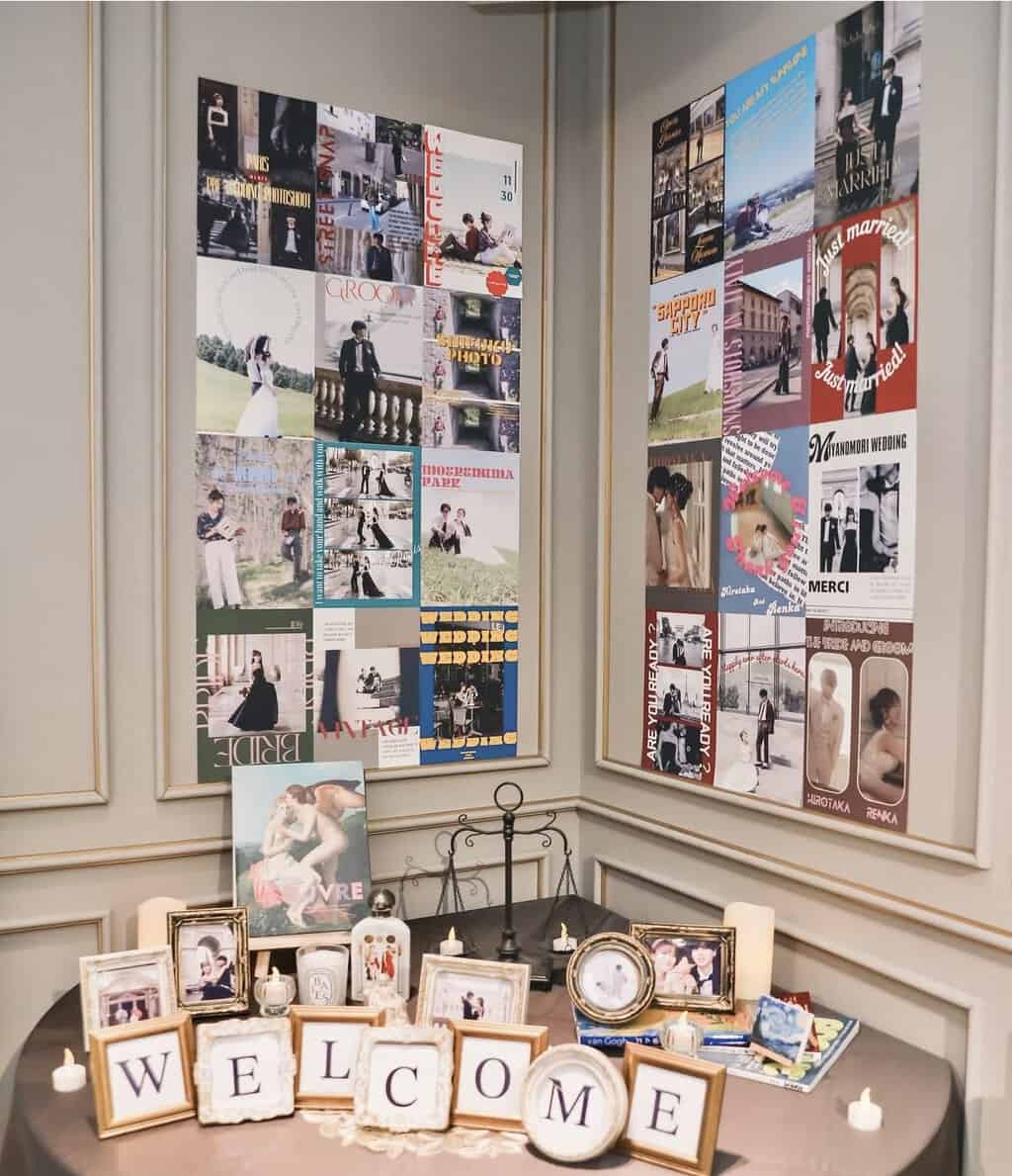 最近では、ウェルカムスペースのトレンドとして、ウェルカムポスターを複数枚飾り、写真や小物と一緒にレイアウトするコーディネートも人気です!