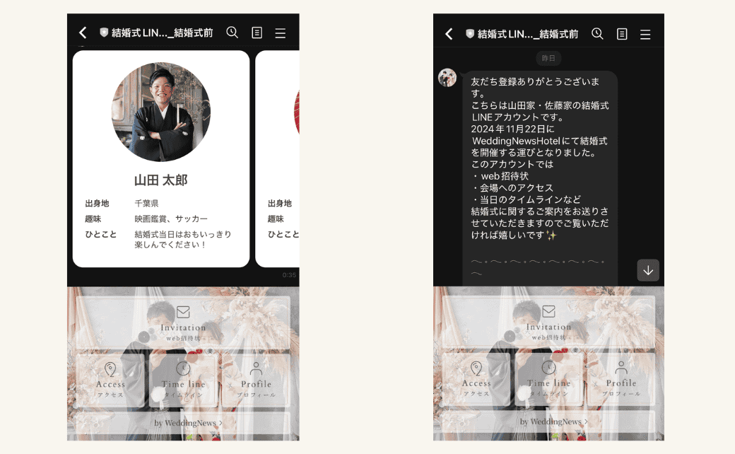 「どんな結婚式LINEが作れるの?」という方はこちらをチェック!LINEアプリ上で”ともだち登録”すると、ウェディングニュースの結婚式LINEメーカーで作成した結婚式LINEをチェックできます♡