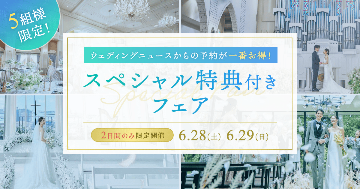 「ウェディングニュースをご利用の皆様に喜んでいただきたい!」という思いから、特別な来館特典をご用意いただける式場を募り、各式場限定5組の*スペシャル来館特典*をご用意いただきました! 【6/28(土)・29(日)】のフェアをウェディングニュースから予約した方だけに、最大1万円分ギフト券など、式場様からの*来館特典*がもらえる限定キャンペーンを開催します♡ 式場を検討中のカップル様はぜひこの機会をお見逃しなく!
