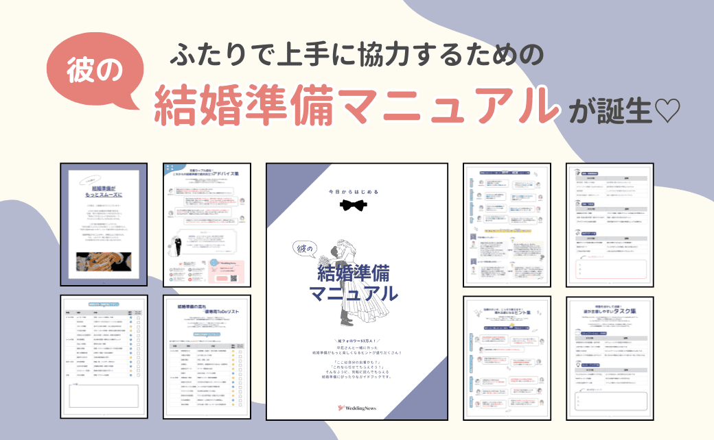 ウェディングニュースから、無料でダウンロードできる『彼の結婚準備マニュアル』が登場♡そのまま使っても良し◎中身を自分たち仕様にアレンジして使用しても良し◎ぜひ活用してお二人の素敵な結婚式準備にお役立てくださいね♡