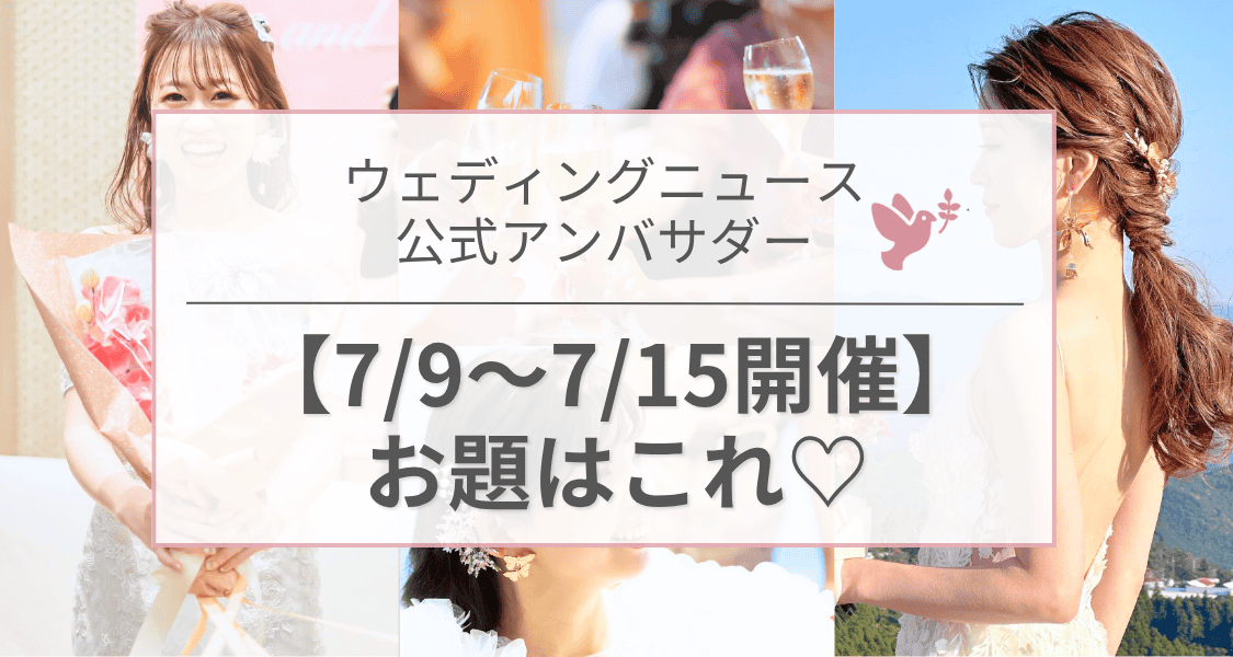 7/9(水)〜7/15(火)で開催する今回は、プロポーズ・ギフト・花嫁ダイエットなどを用意しました!好きなお題を選んでいただき、どのお題をいくつ投稿してもOK*
