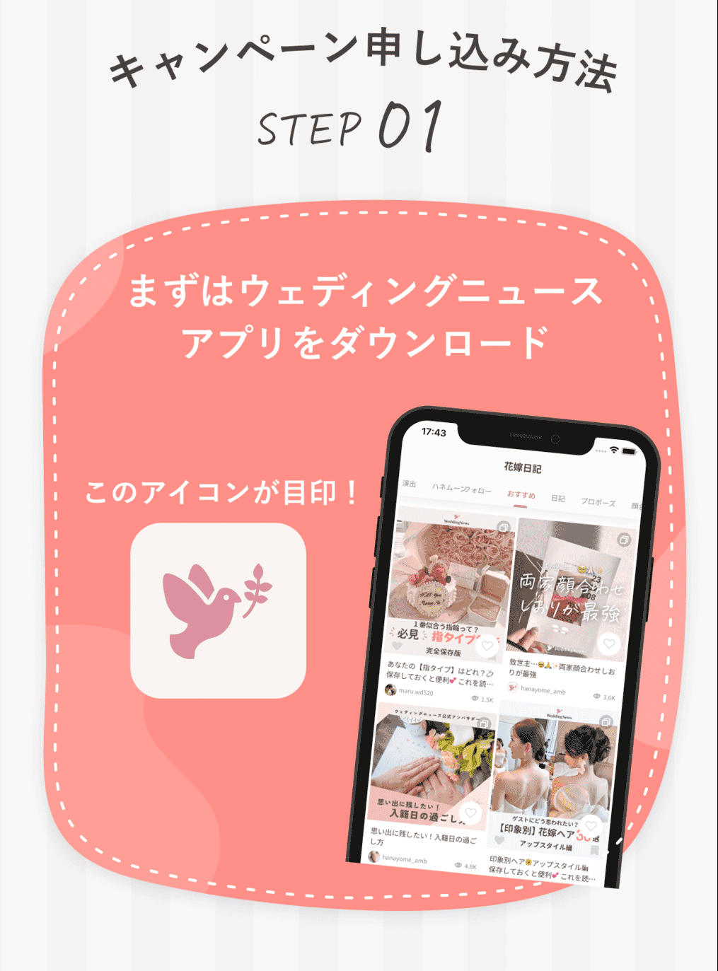 \ 簡単3STEPでもらえる! /STEP1:ウェディングニュースのアプリをダウンロード