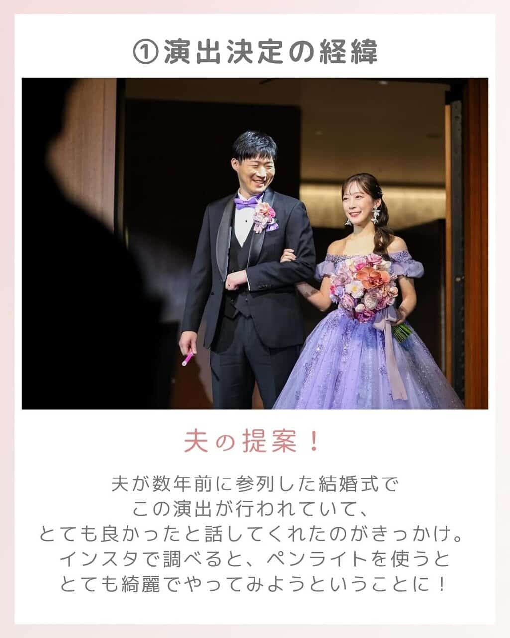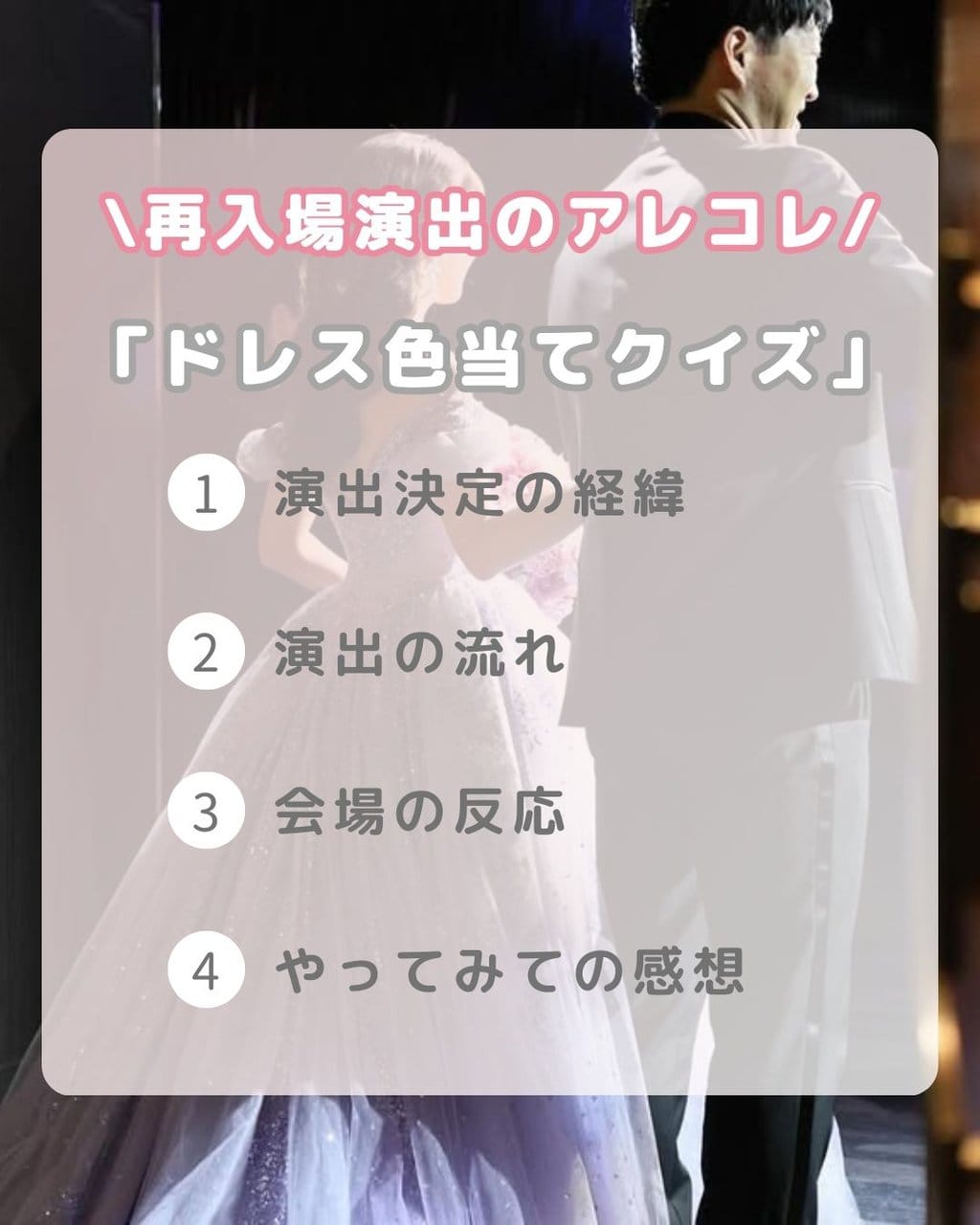 盛り上がる演出の一つでもある、再入場演出!お色直しをした新郎新婦が入場するので、ゲストもドキドキワクワクする瞬間でもあります♡