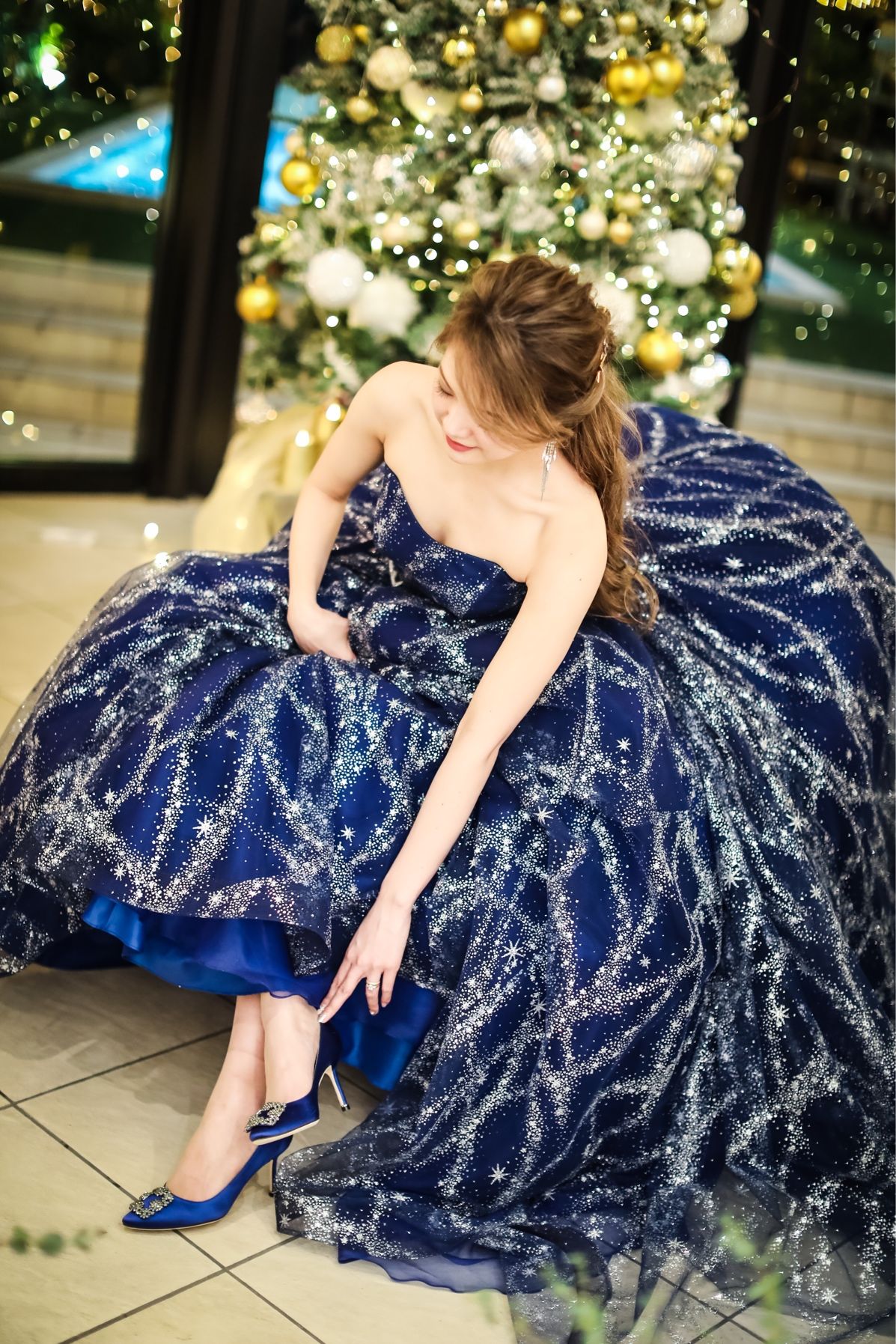 ロイヤルブルーのパンプスに、ブルーのドレス、爽やかでキュートなコーディネートの完成!