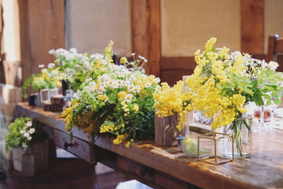 ミモザのイエローの装花が良く似合います♪