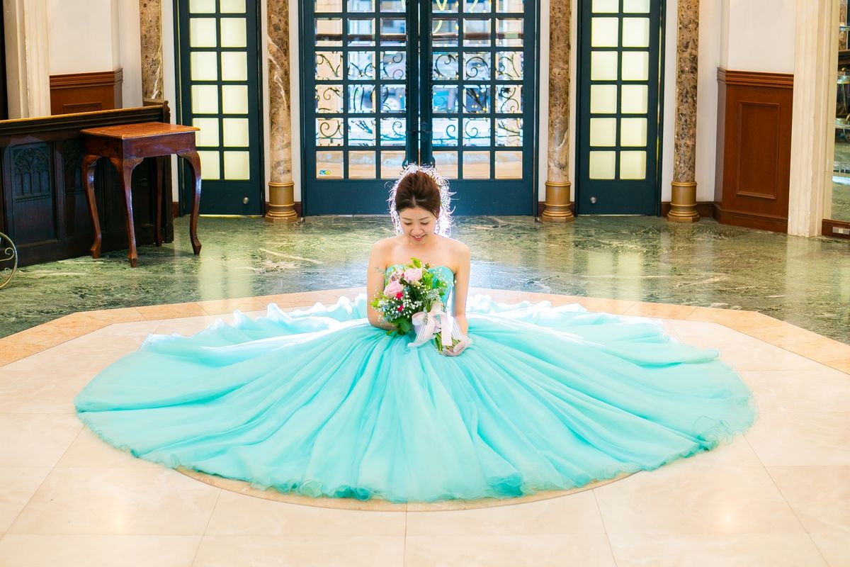 ジミーチュウのティファニーカラーのブライダルシューズ。ドレスの下から少し見えるシューズはおしゃれに決めましょう!