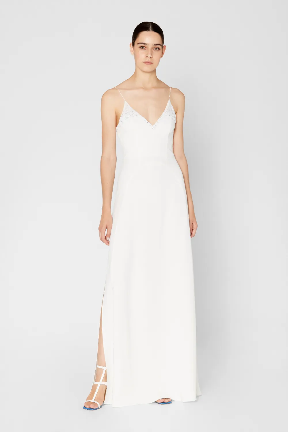 ハリのある素材に切り込まれた深いスリットが印象的な一着は、ビーチでの挙式にぴったり。