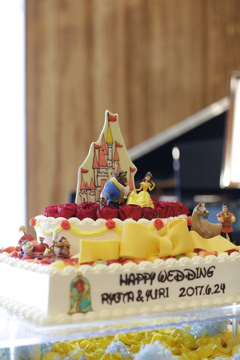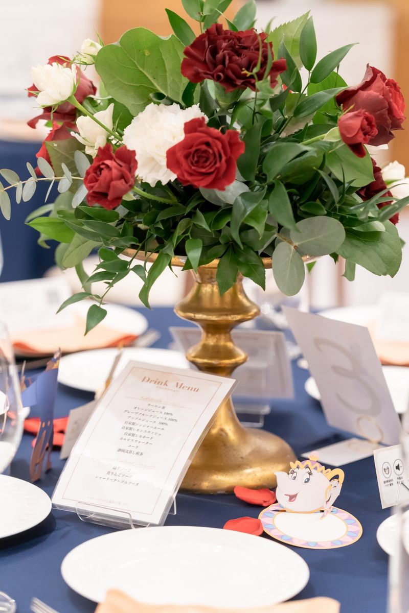 ゴールドをさりげなく忍ばせることとバラを装飾で使うことにより、美女と野獣を再現しています♡