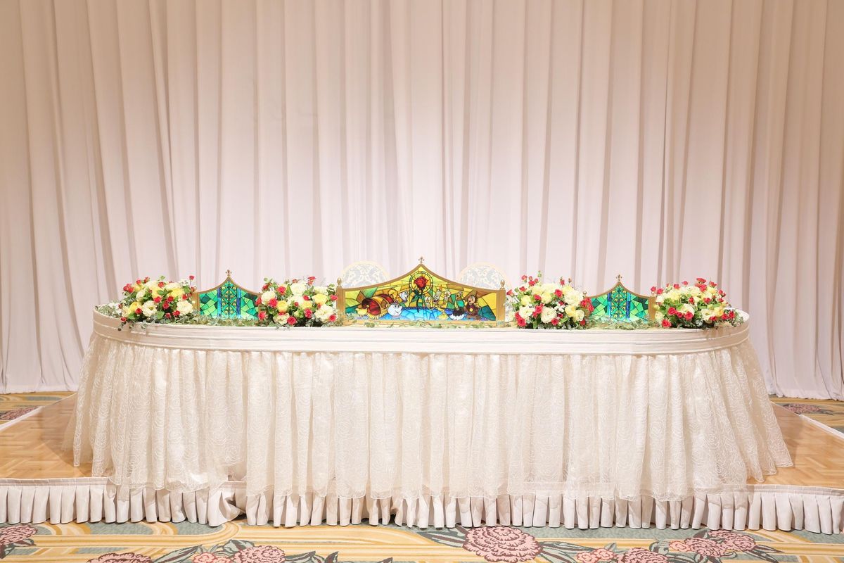 ディズニーアンバサダーホテルの美女と野獣の装花は、ステンドグラスに描かれたキャラクターたちが可愛い♡