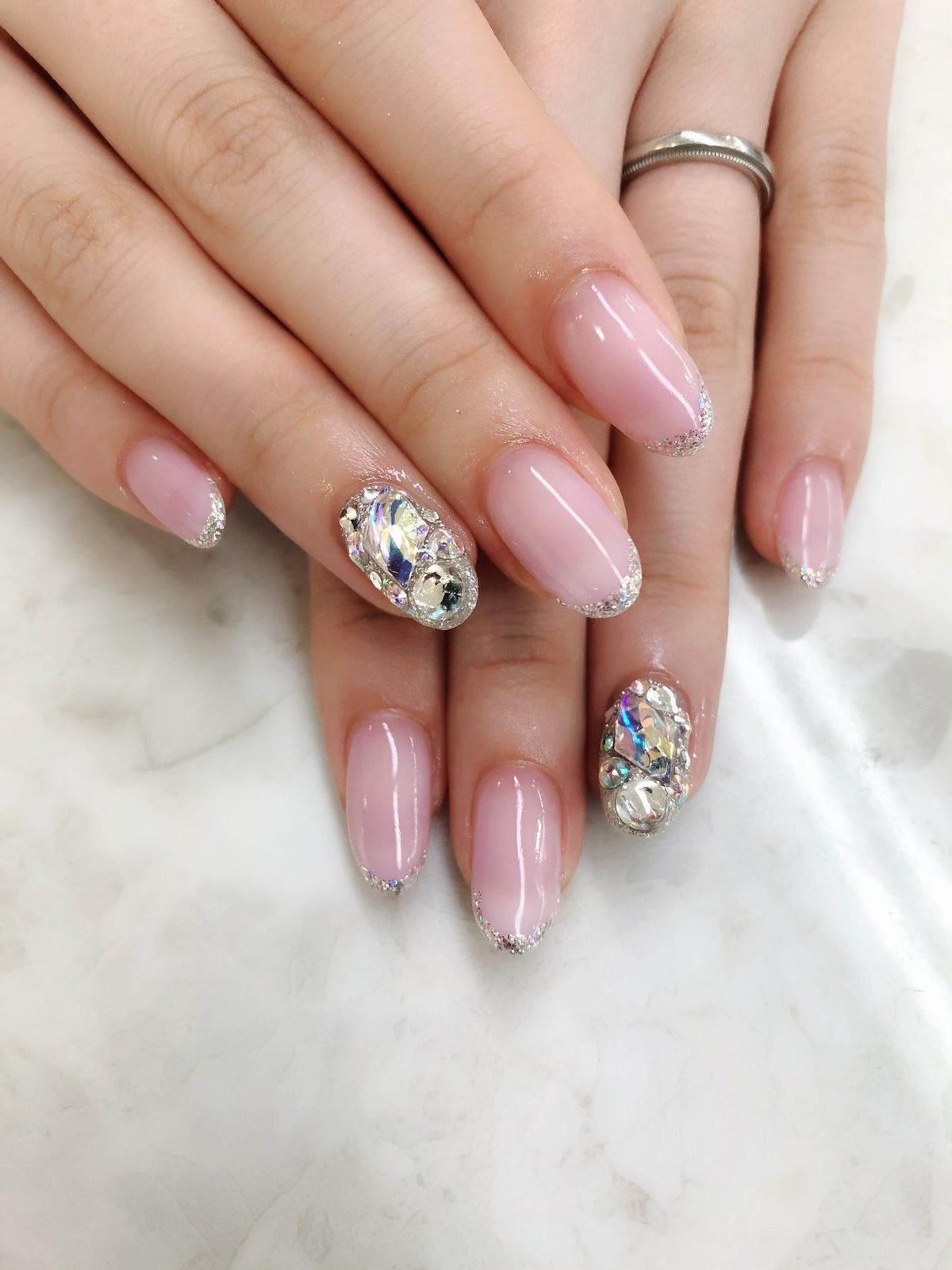 ワンカラーにラメやビジューを散りばめたネイルは純白ドレスにも、カラードレスにも似合いそう!