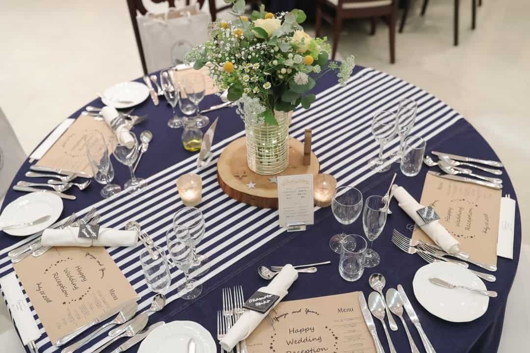 席札やテーブルナンバーを無地にして、ナフキンをボーダーに。