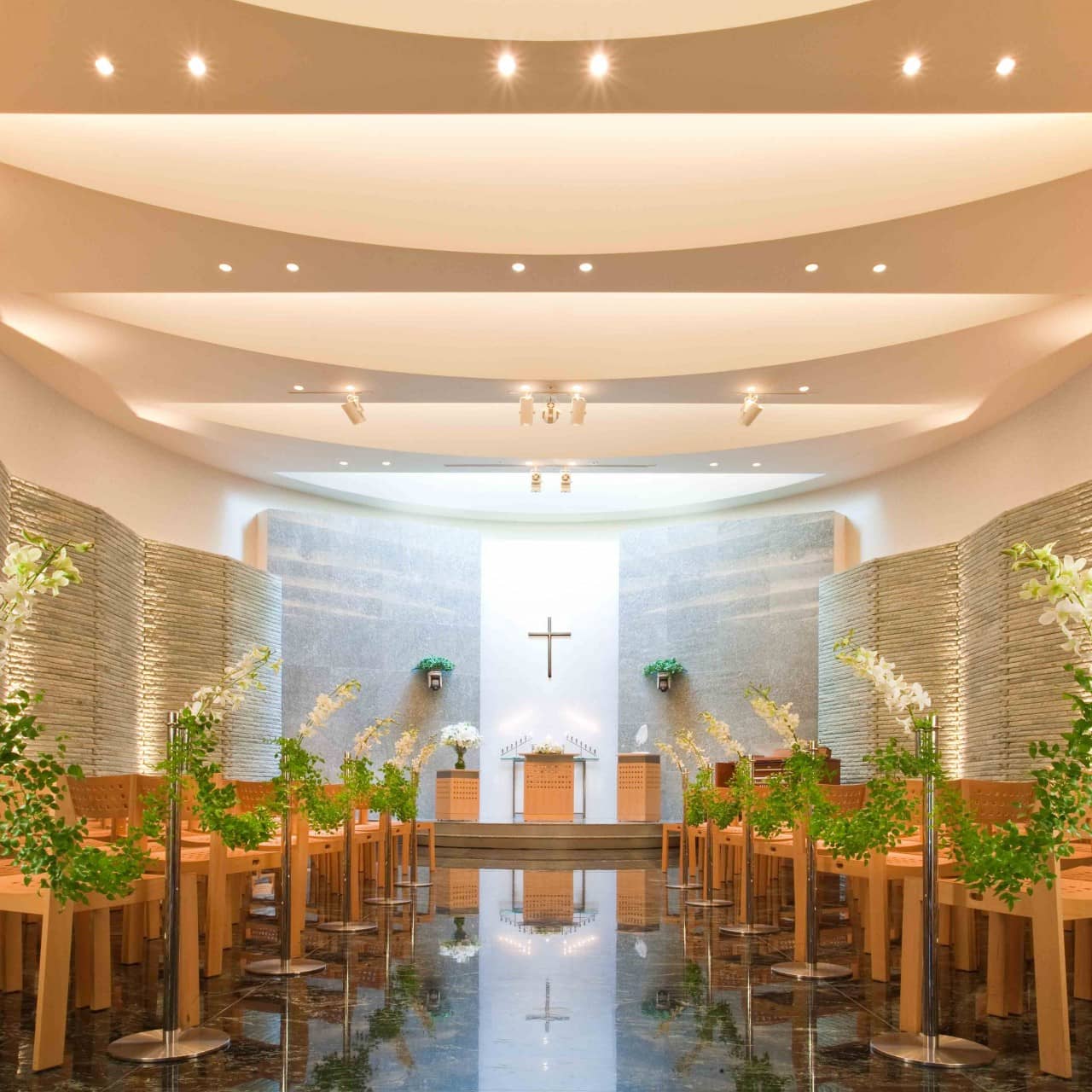 床は白大理石のチャペルで22mのバージンロードの長さを誇ります。