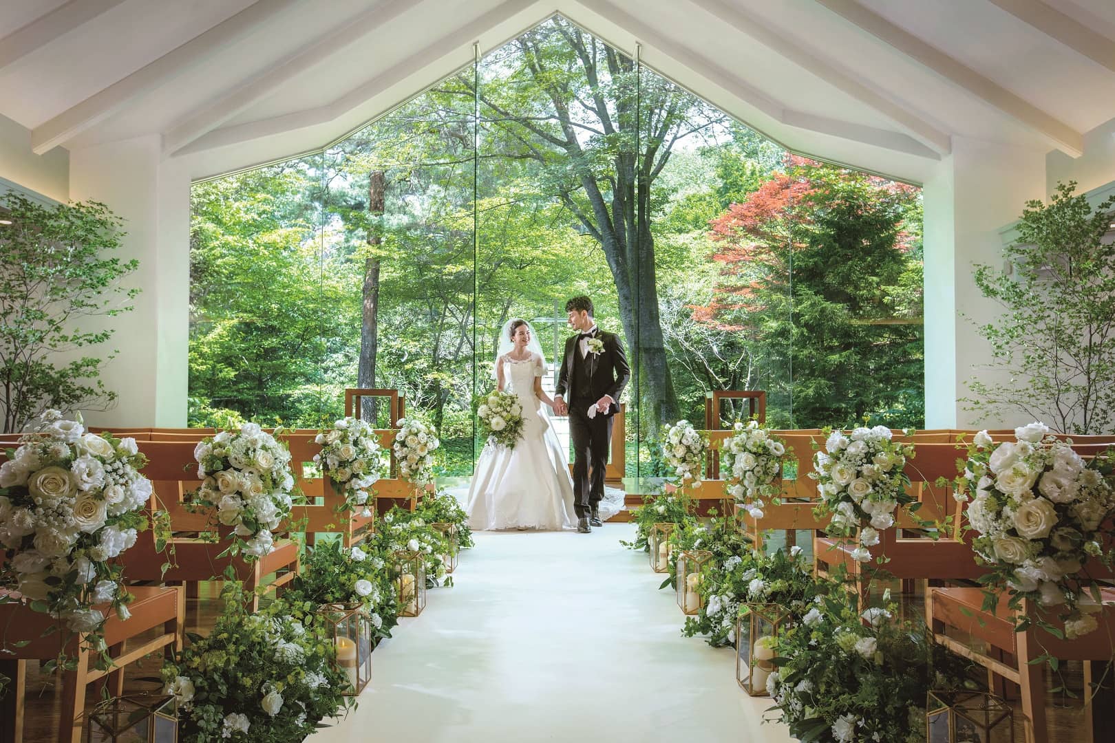 緑豊かな環境に建てられたチャペルは、大きな窓が特徴的です。四季折々の美しい景色が1つの演出になりますね♡