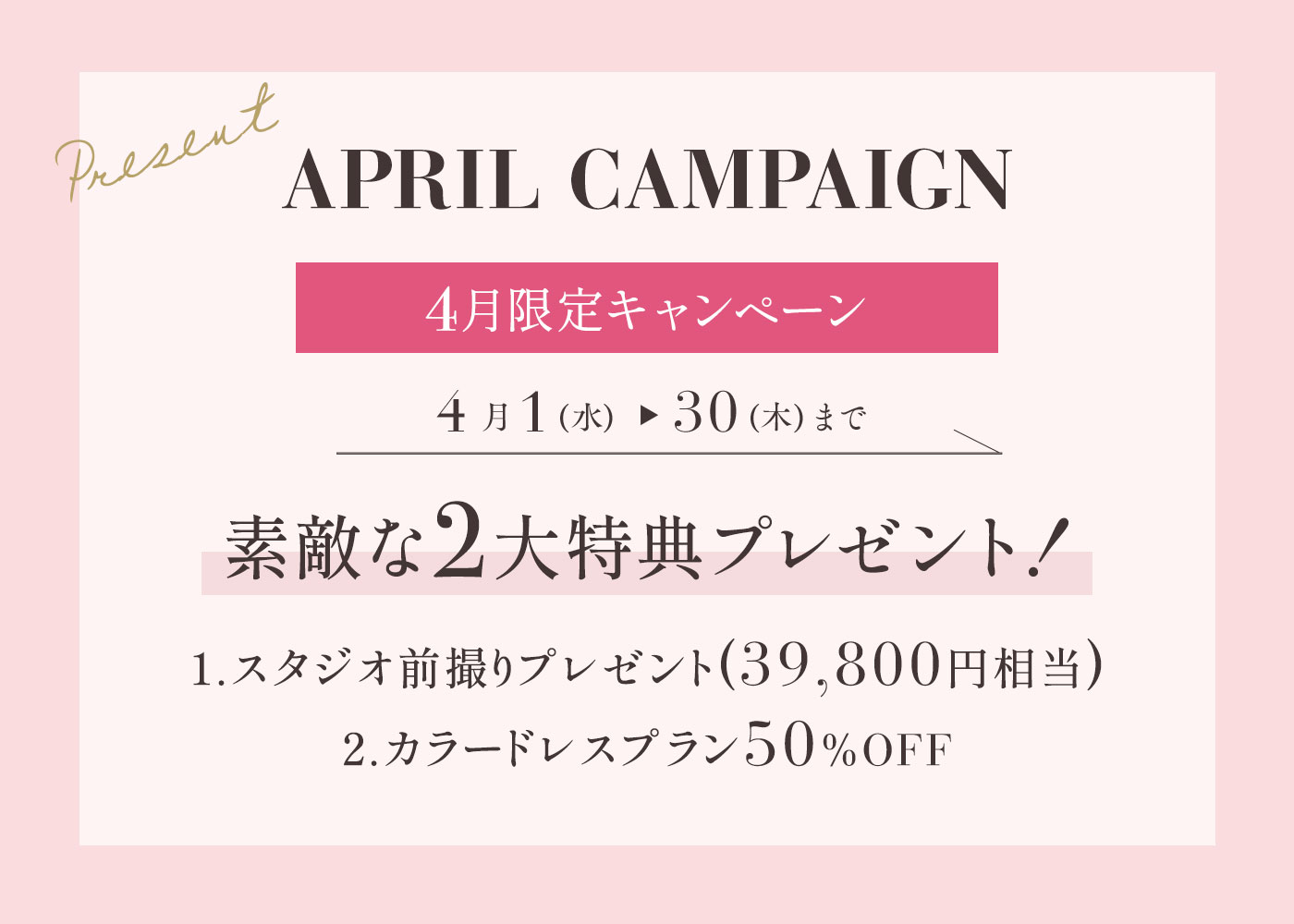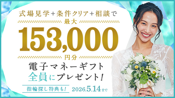 | 注意事項 | ・オンラインフェア、遠隔での式場見学は対象外となります。 ・キャンペーンの注意事項を参照してください。 |