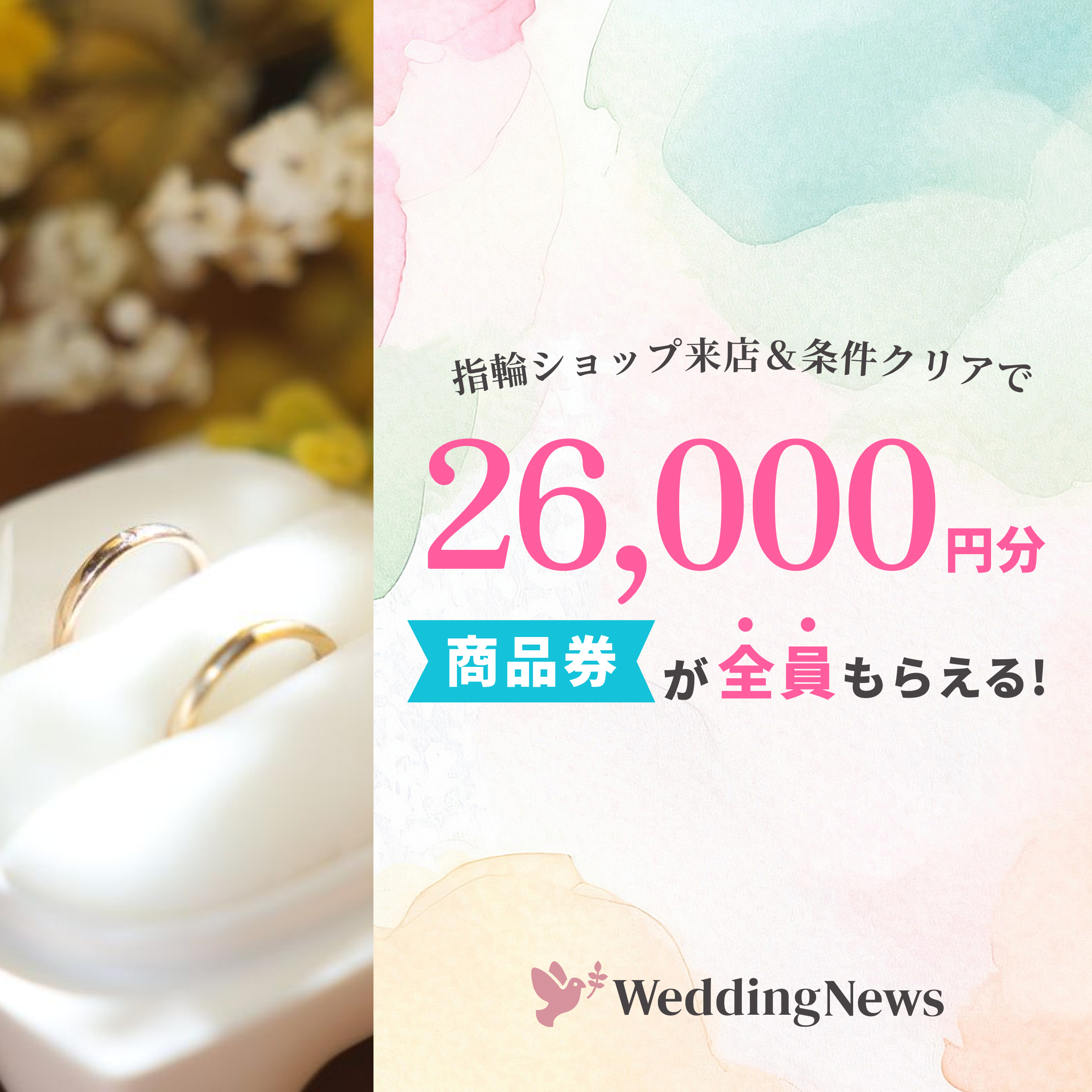 | 応募方法 | ①専用サイトからエントリー GoToエントリーページ ②ウェディングニュース内で指輪ショップ・フェア予約、来店 ③指輪ショップ来店・フェア参加後、期間内にアンケート回答、成約購入報告 |