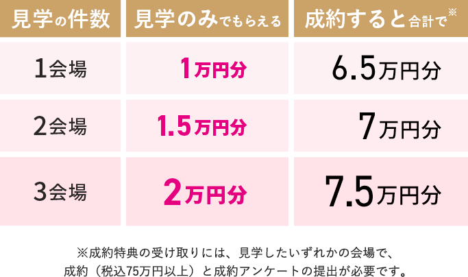 | 特典詳細 | 1件見学で20,000円分 2件見学で35,000円分 3件見学で45,000円分 成約で+30,000円 or ブライダル保険38,000円分 or JTBトラベルギフト 指輪来店で13,000円分 購入報告:13,000円分 式場+指輪どちらも成約で5,000円分 |