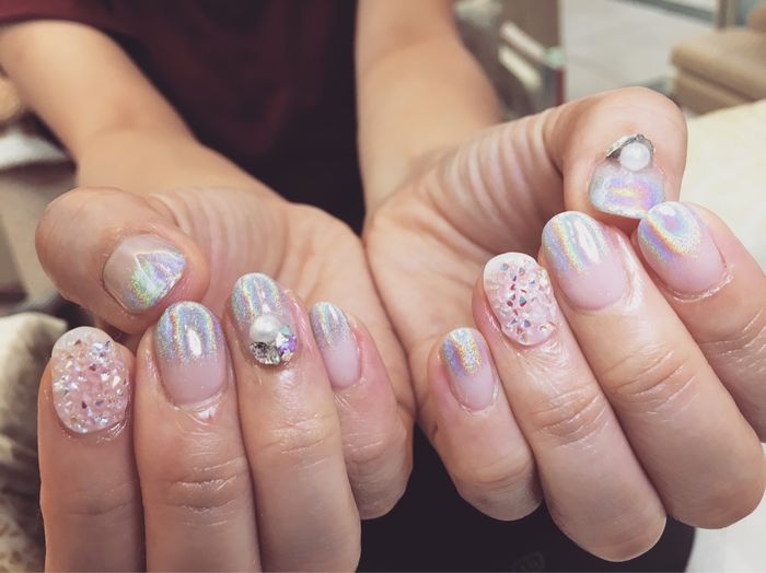 シンプルな色なのにストーンたっぷり華やかなネイル。