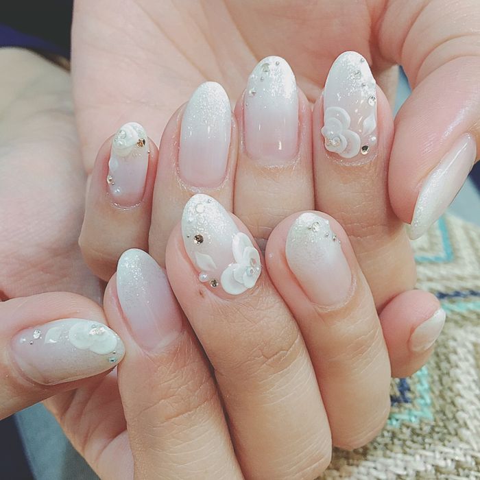 白薔薇の3Dネイルがアクセントの華やかなネイル。