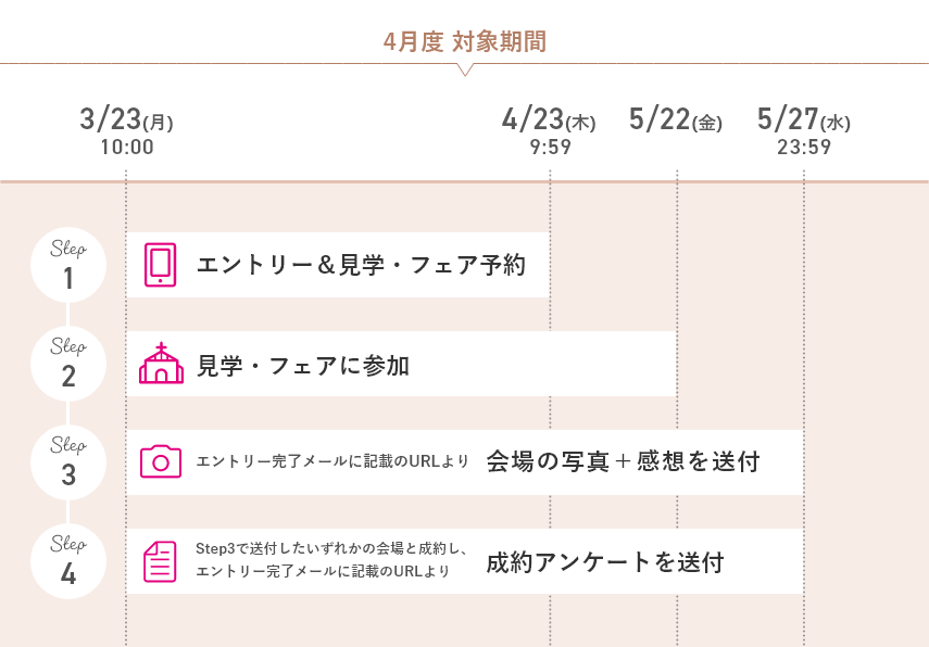 式場見学・ブライダルフェアへの参加、ジュエリーショップへの来店共に2026年5月22日までが期限となりますのでご注意ください!
