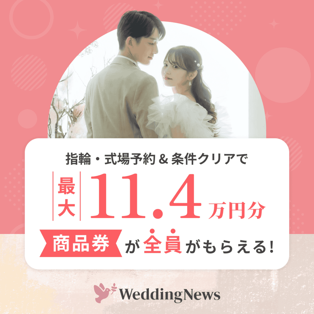ウェディングニュースのGotoウェディングキャンペーンでは、式場や指輪ショップに来店・成約すると、最大11.4万円がもらえるキャンペーンを実施中です😊