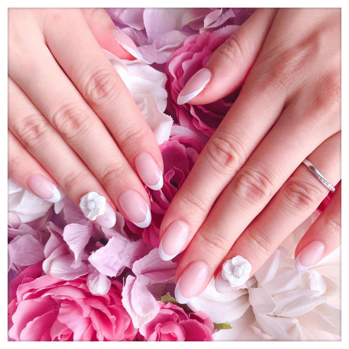 ホワイトのフレンチに薬指には花を添えたシンプルな可愛さのデザインは、清楚なかわいらしさがあり、花嫁ネイルにピッタリのデザインです♡