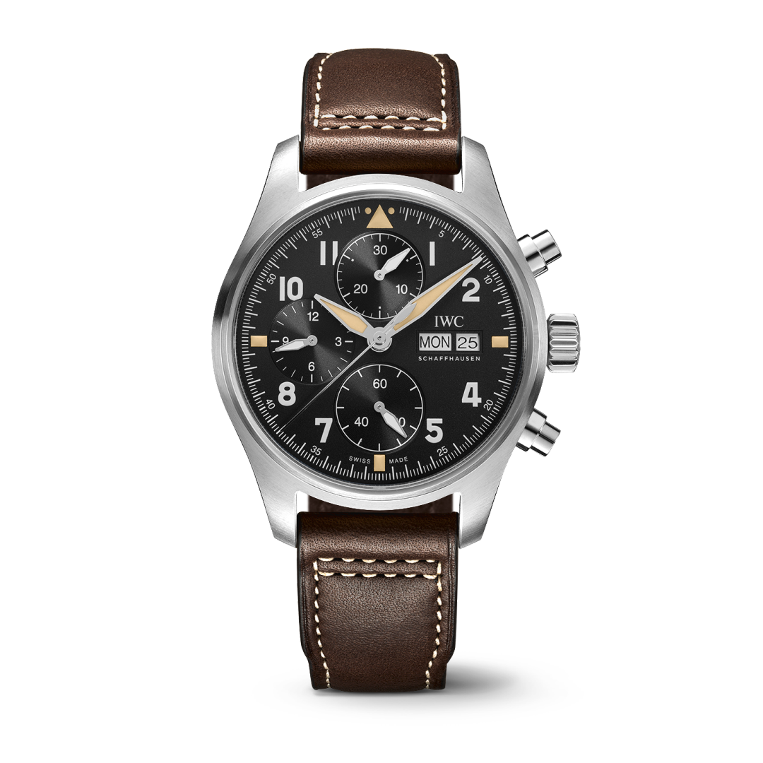 パイロット専用機能の偏流修正角計算機能を搭載。3つのサブダイヤルや9時位置のデイデイト表示をはじめとする視認性の高いデザインが特徴。