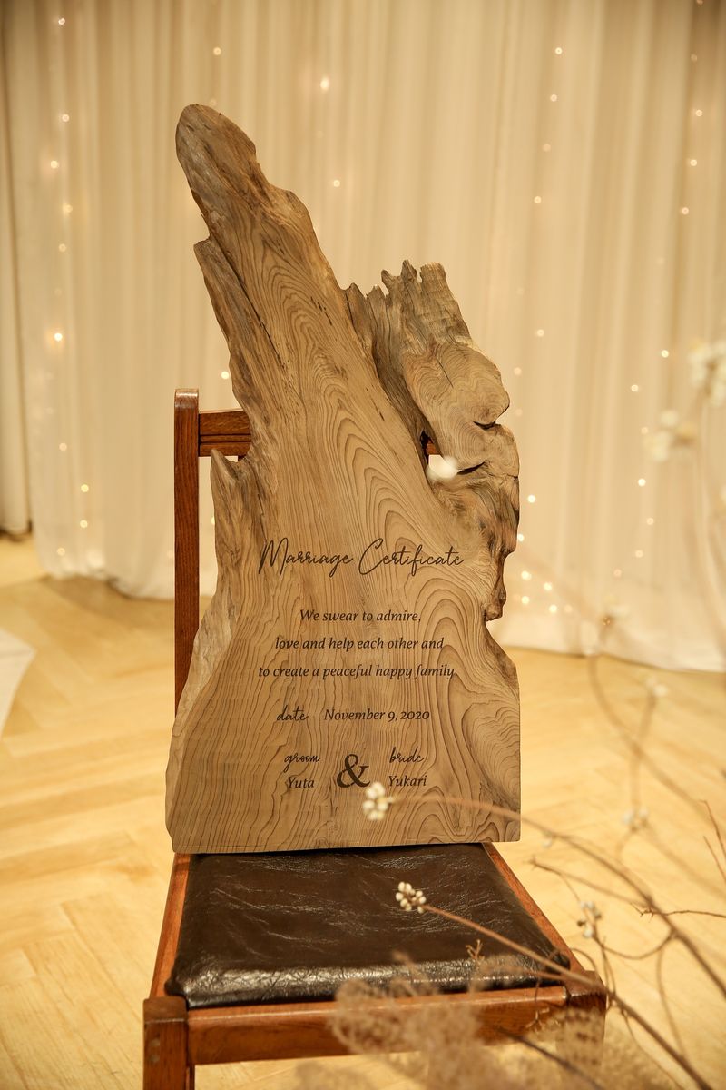 こちらもインパクト大の木の板を使った結婚証明書♡