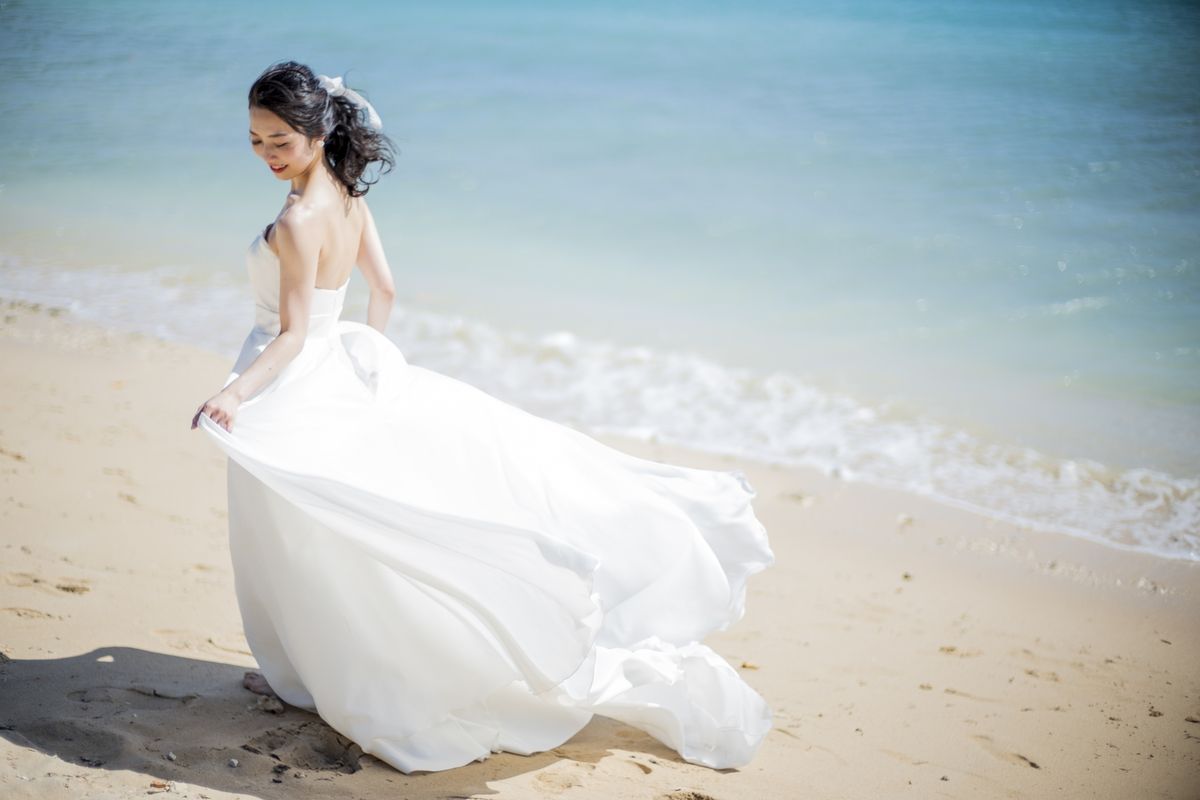 また、ビーチで挙式を行う場合は砂浜を歩くこともあるので動きやすいドレスを選ぶのがお勧め♩海風をうけてふわっと動きが出るような軽やかな素材を意識すると◎